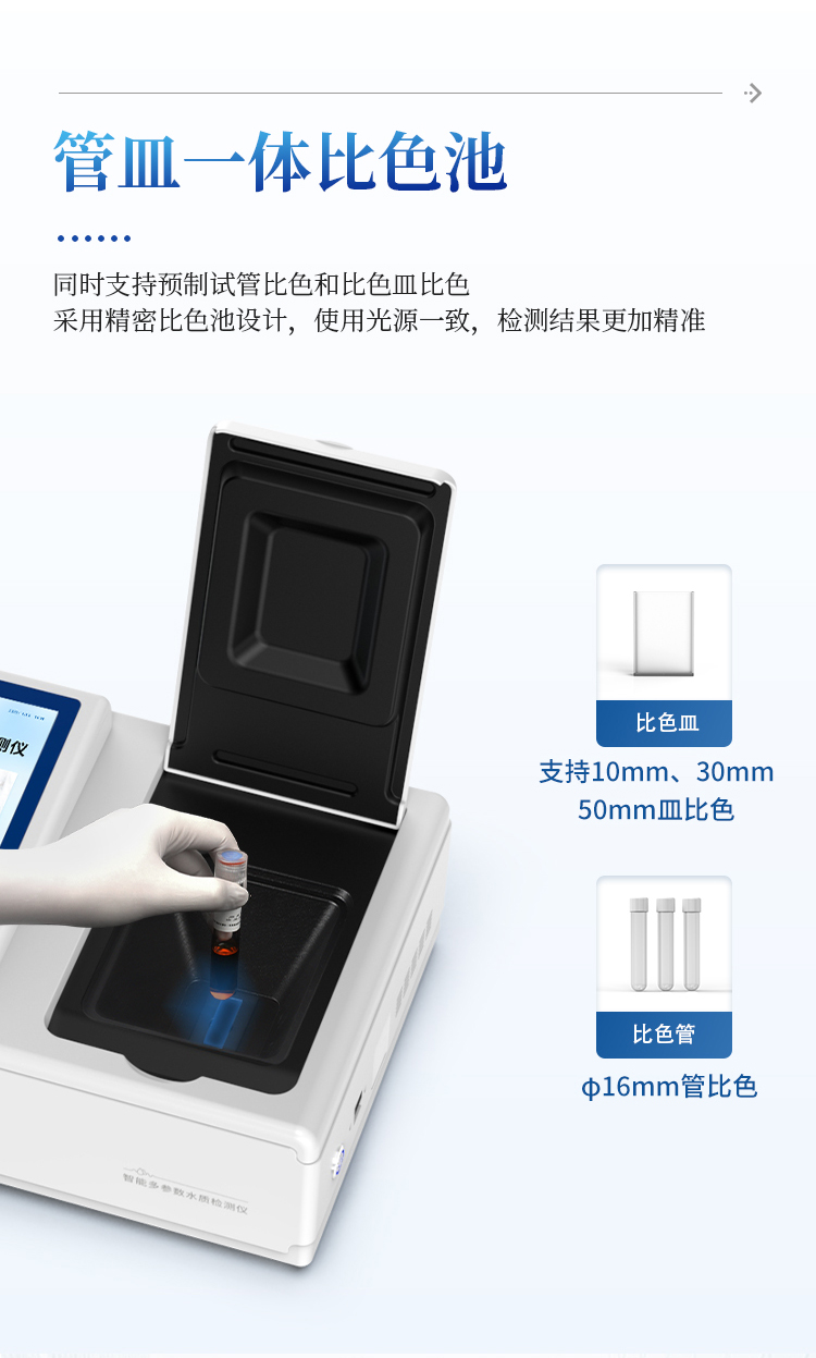 5、支持10mm、30mm、50mm皿比色和φ16mm管比色等比色方式,多元选择,确保测量的准确性;